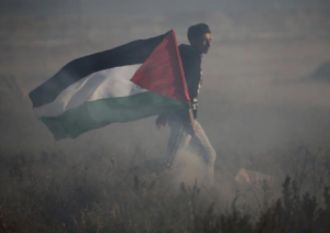 A young man in Gaza, undaunted by tear gas fired by Israeli soldiers, carries the Palestinian flag at a protest in solidarity with Palestinian political prisoners held in Israeli military jails.