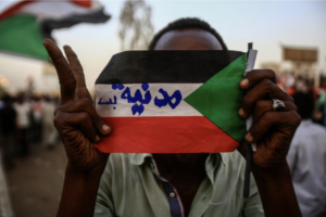 A Sudanese protester holds the national flag with writing in Arabic that means “Civilian Only” during a rally outside the army headquarters in Khartoum on May 2nd. Governments around the world, particularly those in Africa, the Middle East, Europe, & the US are watching developments in Sudan with extreme vigilance. And not just watching but working behind the scenes to make sure the military retains control of the government. All neoliberal (the new colonialism) plans for the continent depend on preventing the spread of democracy in order to facilitate greater plunder. The Sudanese uprising is of the greatest consequence for the future of democracy & freedom in all the African countries. The Sudanese protesters have drawn the lessons particularly of the Egyptian Arab Spring uprising that military rule must be definitively ousted & democratic civilian rule installed.