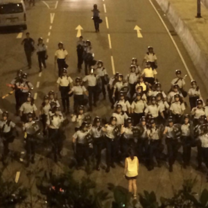 Photo is an activist without umbrella or other defenses standing alone against the socialist-capitalist riot cops in a scene reminiscent of Tank Man in Tiananmen Square.