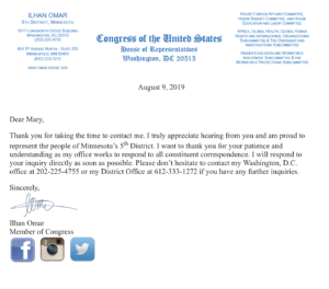 Email response of Ilhan Omar to my request that she speak out for Kashmiris. She has not accepted or declined my request but is considering it. In her letter, she leaves her office phone numbers for any of you who would also like to request she speak for Kashmir.