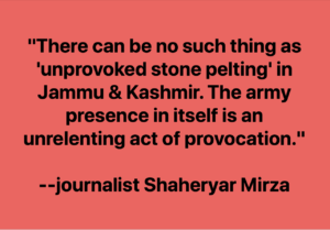 “We met people in villages all over Kashmir, where little kids have been… there is no other word to use… they have been abducted by the police. They have been picked up from their homes in the middle of the night from their beds and they are held indefinitely, illegally, either in army camps or in police stations. They are being beaten up. Their parents have no way of ascertaining whether their children will disappear or be returned.”