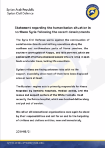 An appeal from the White Helmet rescue workers for humanitarian organizations to put political pressure on Syria & Russia to stop the carpet bombing of Idlib, August 21st, 2019. The Stalinist & Assadist cult that has destroyed & replaced the antiwar movement has made sure there are no popular protests demanding Syria, Russia, & the US-coalition stop the bombing of civilians.