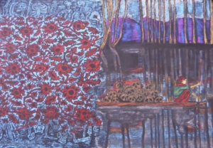 “In her own words, here are her thoughts for the painting shared in 2016: ‘Title — Drifting, size 43×29.5 inches, execution 2014… This work shows Kashmiri woman as witness to the gruesome reality that Kashmiri exist in, day-to-day rowing through the misery of death of their dear ones… The carpet conceals the human skeletons… There is an evocation of numbness in this painful stillness. Hence the title frozen. This also defetishises the imposed exotic colonial gaze…'”