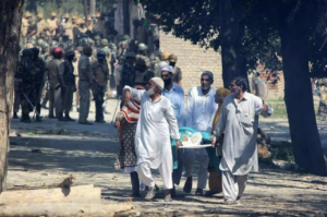 This is the funeral procession of a civilian who was killed. The mourners are not allowed to take the corpse to the graveyard and are being dispersed by pellets, teargas shelling. The dead is not given funeral rights in Kashmir and the living are not allowed to mourn. That’s what’s happening”