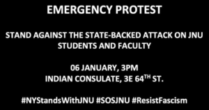 NYC protest against the police & mob attacks on students at Jawaharlal Nehru University in New Delhi. This is a chance to stand against the Indian occupation of Kashmir, the legalization of pogroms against Indian Muslims, & the extreme violence used to accomplish Indian fascism.