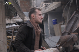 A young Syrian man in Aleppo watches a White Helmet rescue team pull his family from the rubble caused by Syrian & Russian bombing, January 21, 2020.