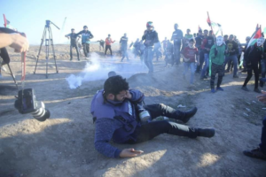 Another Palestinian photojournalist in a press vest was shot in the eye by Israeli snipers while covering protests at the Gaza border. Atiya Darwish, shown here after being shot, was told by doctors that he has lost the vision in his left eye.