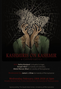 An education event about Kashmir in Philadelphia on February 19th: there was also an educational event on the same day at UMass Amherst. The political art of Mir Suhail Qadiri gets around.