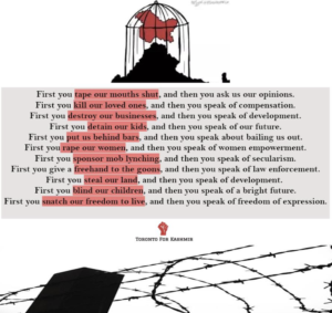 News October 30, 2019 Solidarity “First you tape our mouths shut, and then you ask us our opinions….” (From Toronto For Kashmir)