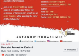Sydney, Australia #StandWithKashmir protest, October 27th, 2019.
