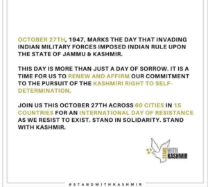 For those who want to know why there are so many #StandWithKashmir vigils, protests, & events planned for October 27th, 2019: October 27th marks the 72nd year of illegal occupation of Kashmir!