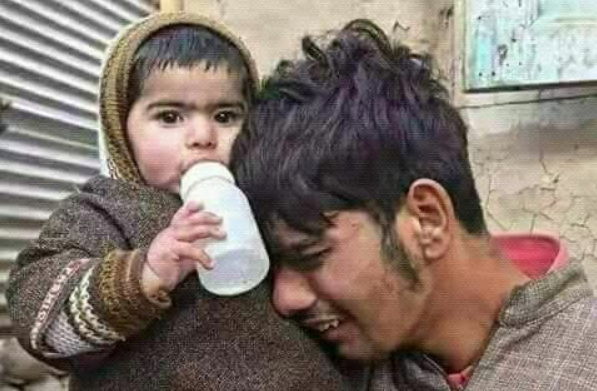 This grieving man is holding 11-month-old Zaira at the funeral prayers of her 25-year-old mother Rubina Jan in the Shopian district about 45 km from Srinagar. The young mother was killed during one the Indian occupying armies late night prowl to kill operations when they opened fire on a group of unarmed defenseless protesters. A nearby hospital admitted over 20 injured protesters, some with gun shot injuries. Four family homes were reduced to rubble by the soldiers.