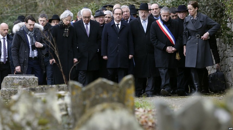 This is French president Francois Hollande in Sarre-Union in northeast France, where 300 graves in a Jewish cemetery were vandalized & desecrated. Five adolescents were arrested for the crime. If the kids had Arabic ancestry & weren’t just thuggish, this would be headline news.