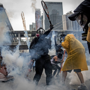 A Hong Kong democracy protester hits a tear gas canister back at police with a tennis racket: what Tony Dewberry calls ‘going the full Hong Kong’.