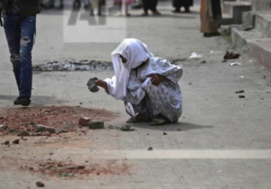 A senior Kashmiri woman breaking up stones to hand out to stone pelters against Indian troops at protests on Friday, August 30th, 2019.