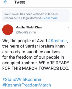 Madiha Shakil Khan, among the eight who the Indian Home Ministry asked Twitter to suspend, received this message that one of her tweets was ‘withheld in India’. The fight for freedom of speech is integral to the struggle for human, democratic, civil, & national freedom & no one knows that better than Kashmiris who remain, now nine days, on a telecommunications lockdown.