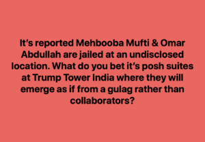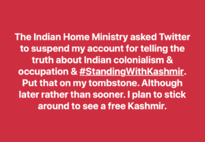 According to this report in India Today, the Indian Home Ministry has contacted Twitter “to suspend eight Kashmir-based accounts for spreading rumours,” including my Twitter account: https://twitter.com/mscully94. I have never been more honored than to be declared an enemy of the Modi government & a supporter of the Kashmiri freedom struggle.