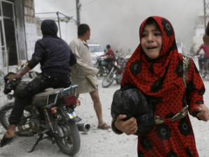 This crying, scared little girl in the town of Kfar Ruma, Idlib is running for cover from airstrikes by Syrian & Russian bombers. Contrary to the claims of the Assad dictatorship & its irredeemable guppies, there were over three million civilians in Idlib, including one million children, when the bombing offensive began on April 26th. Over 300,000 have been forced to flee for their lives. Idlib is not a place where only terrorists live–even if we agreed about who was a terrorist under the rubrics of the Islamophobic ‘war on terror.’